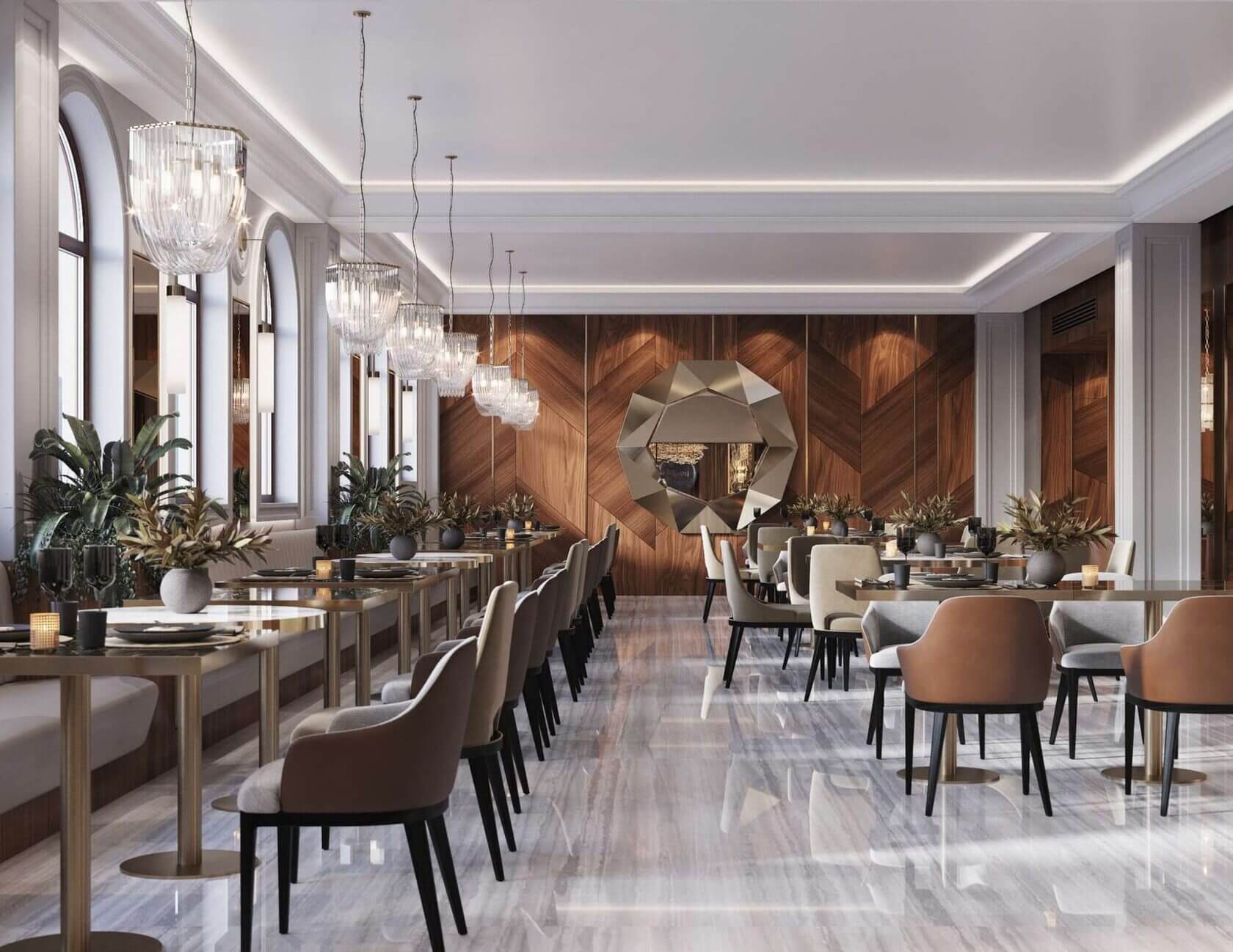 Внутренние пространства оформлены с акцентом на премиальный комфорт и стиль. Высокие потолки, натуральные материалы и продуманные детали создают атмосферу уюта.